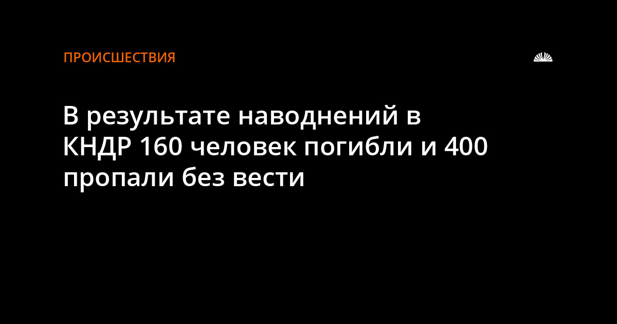 В результате наводнений в КНДР 160 человек погибли и 400 пропали без вести, говорится в сообщении официального северокорейского агентства ЦТАК. При этом наводнения и сильные дожди лишили крова более 212 тыс. человек и затопили более 65 тыс. гектаров пахотных земель. В результате стихийного бедствия были разрушены более 8,6 тыс. домов, более 1,4 тыс. школ, больниц и заводов были вынуждены прекратить свою работу, отмечается в сообщении. Его цитирует "Интерфакс".