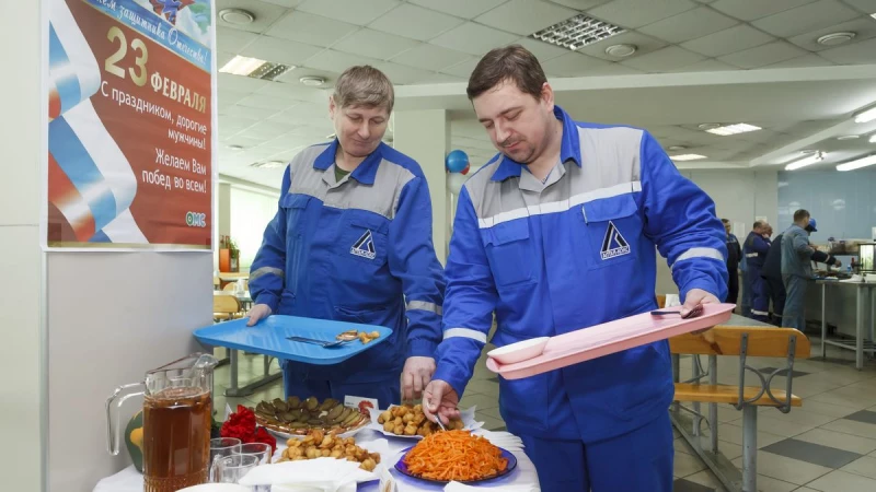 Сотрудники столовых "Алтай-Кокса" традиционно поздравляют мужчин с праздником, накрывают для них щедрые гостевые столы. В этом году мужчин угощали салатом из моркови по-корейски, бутербродами, необычными поджаренными пельмешками, компотом из сухофруктов. Гостевой стол украшали атрибуты настоящего солдата: автомат, защитный шлем и красные гвоздики.