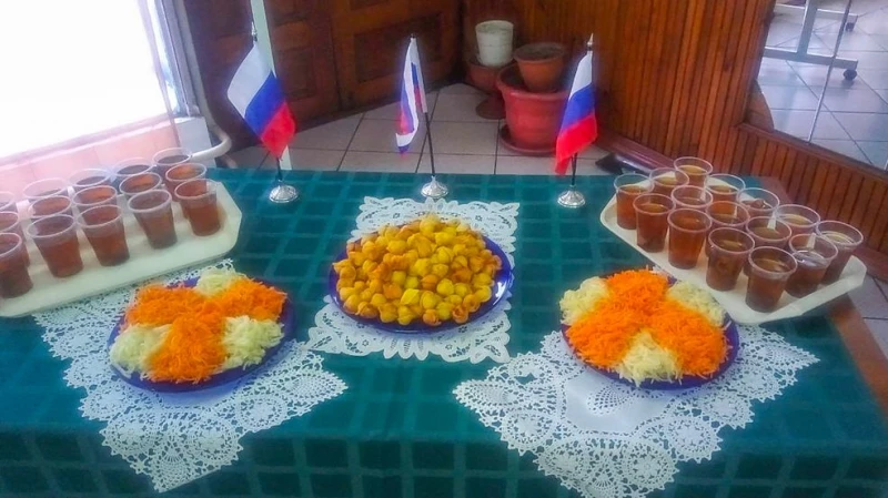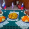 Сотрудников угостили салатами, бутербродами, необычными поджаренными пельмешками, компотом из сухофруктов и другими напитками. Гостевой стол украшали атрибуты настоящего солдата.