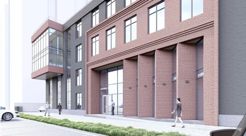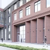 Элементы из темно-красного кирпича на фасаде рифмуется с историческим соседом. Проект выдержан в традициях сибирской архитектуры на ассоциативном уровне с помощью характерных карнизов, поясков и «сухариков» - ряда небольших прямоугольных выступов. Акцент – большая входная группа.