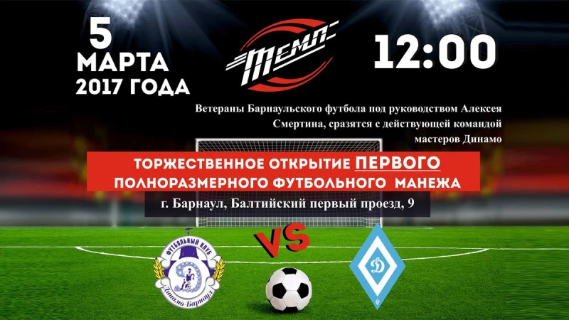 Такое событие для Алтайского края является уникальным, ведь спортивный клуб ТЕМП — это первый полноразмерный футбольный манеж, не имеющий аналогов. Манеж, построенный за счет частных инвестиций, общей площадью 5760 кв. м, используется для развития детско-юношеского футбола в Алтайском крае, где занимается более 450 детей и подростков разных возрастов.