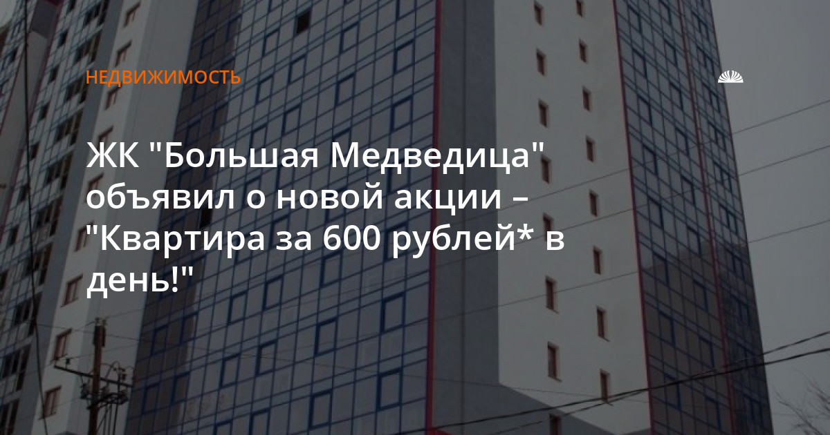 ЖК "Большая Медведица" объявил о новой акции – "Квартира за 600 рублей* в день!". Такой кредит клиентам жилого комплекса предлагает Сбербанк. Принять участие в акции очень просто – нужно лишь приобрести квартиру в ипотеку, заплатив первоначальный взнос. Предложение действует на все квартиры в жилом комплексе.