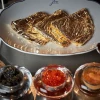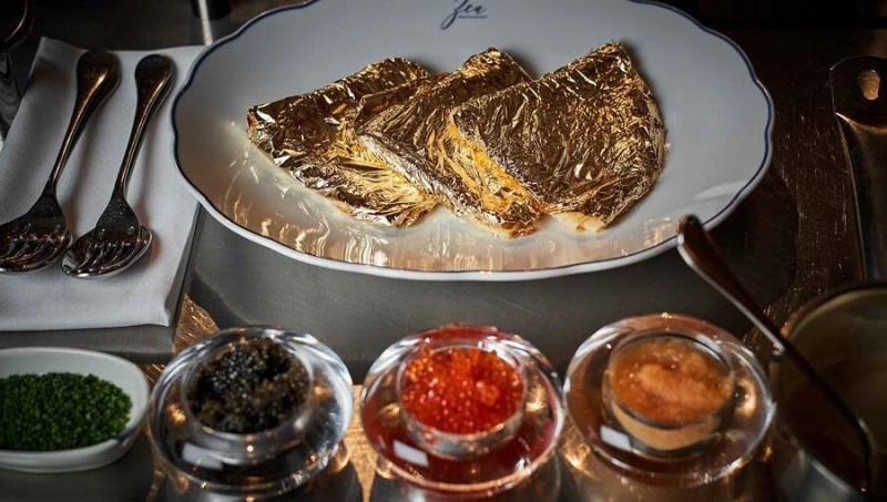 К блюду с благородным металлом также подают красную, черную и щучью икру. Стоят люксовые блины 8,5 тыс. рублей за порцию.