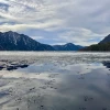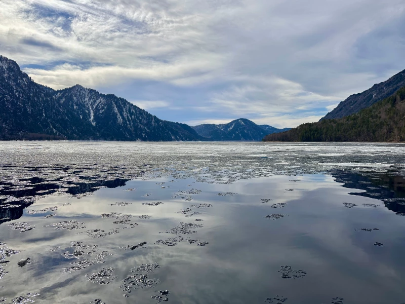 В этом году Телецкое озеро замерзло не полностью. Лед покрыл лишь северную часть и заливы. Но остальная акватория озера простояла всю зиму без покрова.