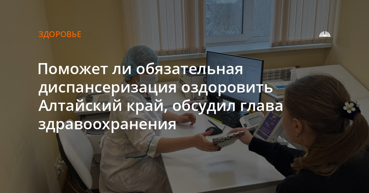 Ежегодно диспансеризация проходит в Алтайском крае с 2013 года в рамках программы государственных гарантий бесплатного оказания гражданам медицинской помощи. Каждый взрослый гражданин, имеющий полис ОМС, может в удобное время прийти в поликлинику по месту жительства и пройти необходимые обследования.