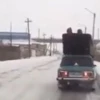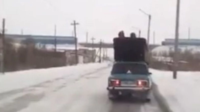 На кадрах видно, что по улице Томской в сторону железнодорожного моста едет автомобиль "Жигули". На крыше транспортного средства веревками закреплен небольшой диван, в котором сидят двое пассажиров. Экстремалы, сидя на диване, радостно машут автомобилистам.
