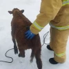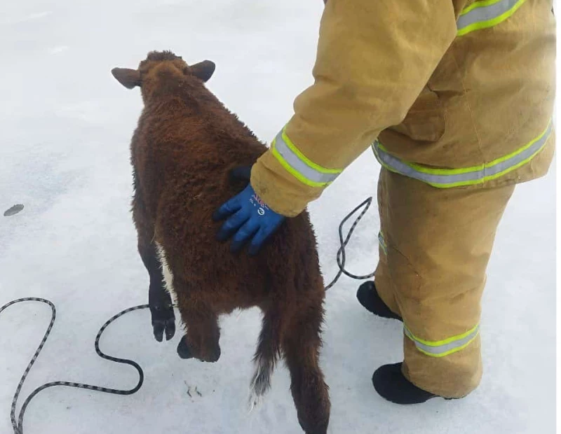 Теленок соскользнул в реку со льда и не смог выбраться сам. Очевидцы вызвали спасателей.