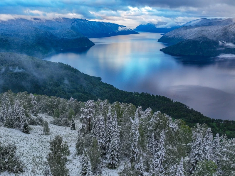 Недавно берега Телецкого озера окутала холодная погода — воздух остыл до минимума в +1 ...+2 градуса, моросящий дождик перемежался снегопадами, кое-где даже выпал град.