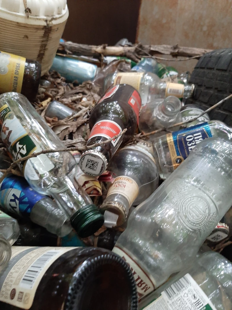 Вход во двор этого дома — настоящее «место силы». Здесь по вечерам собираются тусовки страждущих. А после общения и распития бутылки бережно складируются в ... нишу забора.