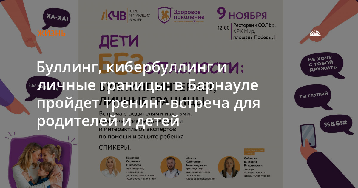 9 ноября Клуб Читающих Врачей проведет в Барнауле первую встречу, где за одним столом соберутся родители и их дети. Темой мероприятия станет «ДетиБЕЗопасности: буллинг, интернет, личные границы».