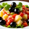 - Виноград или маслины разрезать пополам, удалить косточки, и половинки выложить поверх салата, расположить их внахлест для создания эффекта виноградной грозди.
