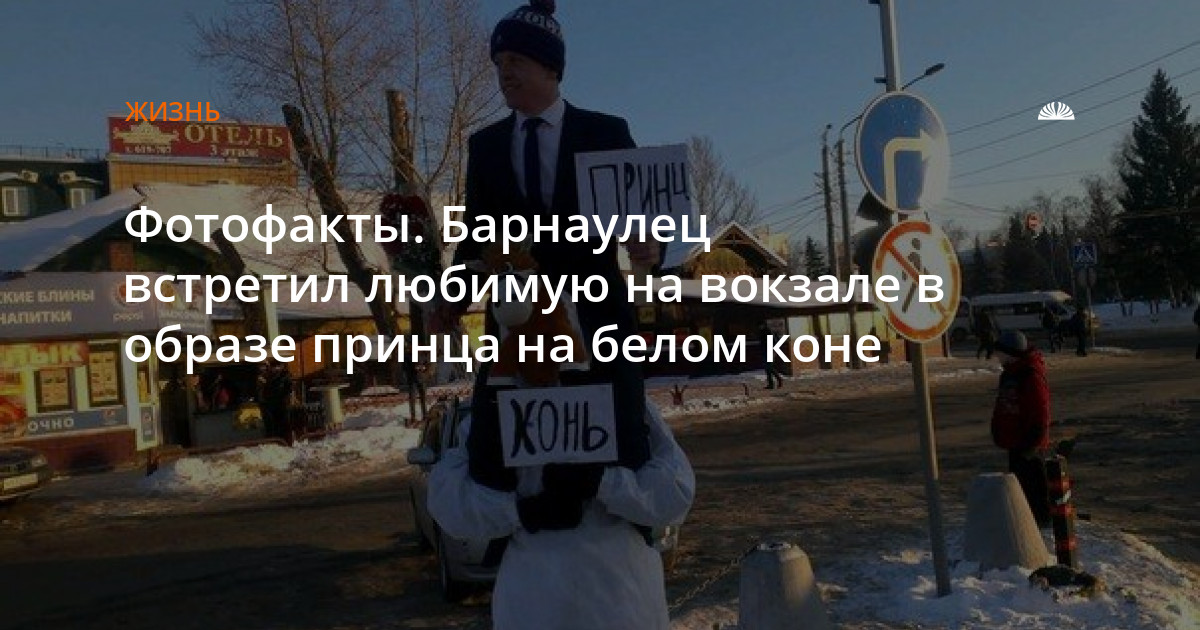 14 февраля на барнаульском автовокзале горожанин встретил свою девушку необычным образом. Молодой человек предстал в образе принца на белом коне, только вместо скакуна и монарших одежд у него были таблички с надписями "принц" и "конь".