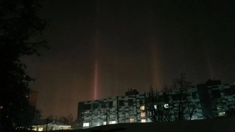 Здание на фото — офисный центр на пр. Социалистическом, 109, вид со двора. Наш читатель предположил, что "северное сияние" — это свет от фонарей, причудливо застывший и преломленный во влажном морозном воздухе.