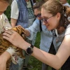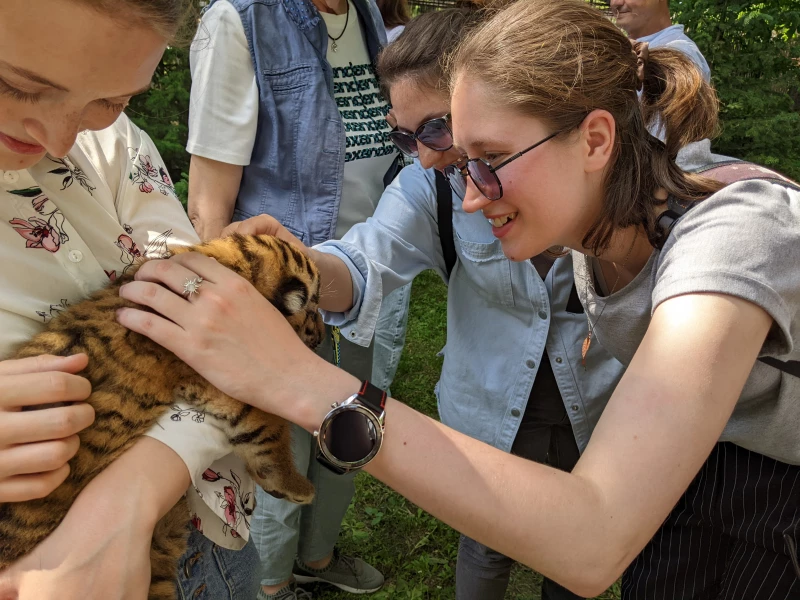 О многом нам пытались рассказать тигрята. Мама Багира любезно разрешила нам их погладить, потискать и подержать в руках. Один из малышей кричал громче всех. Подозреваем, что жаловался на питание. Дело в том, что в этом году тигрица выкармливает пятерых детишек, а сосков у мамы всего четыре. Сотрудники зоопарка, конечно, поят молочком всех полосатиков без исключения, но бороться за грудь они не перестают.