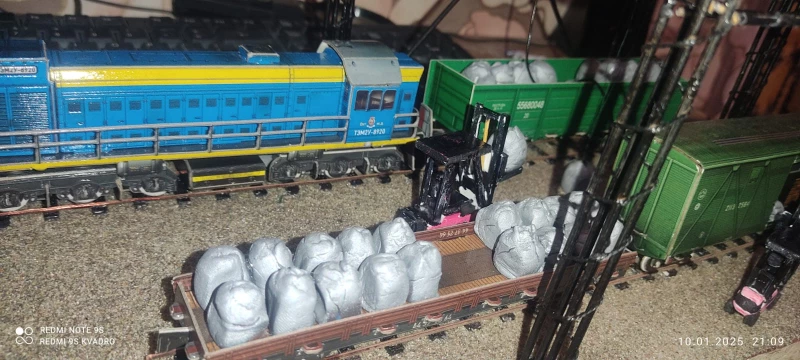 А вот на модель погрузочного терминала у Юрия ушло всего две недели. И это при том, что станция и тепловоз выполнены с ювелирной точностью — вплоть до размеренных кранбалок и мешков.