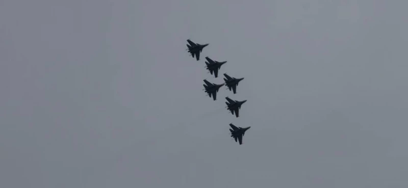 И вся эта шумная толпа вмиг затихла при первых звуках двигателей издалека. Шесть истребителей Су-30СМ показались с северной стороны, пронеслись над высотками и плавно вывернули к реке под рукоплескания людей.