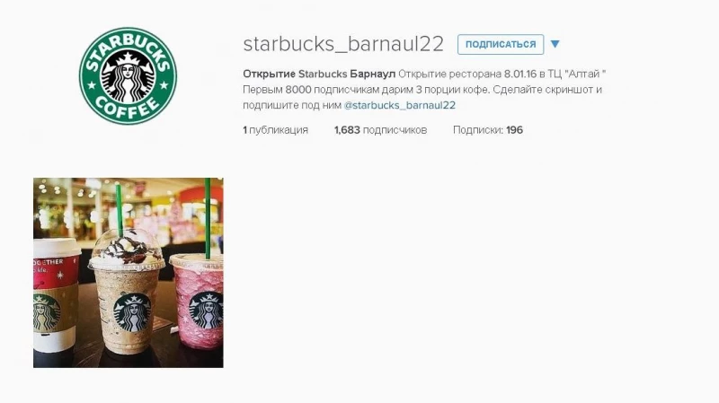 Аналогичные аккаунты на этой неделе появились и в других городах России. Те же условия акции и даже дата открытия кофейни указаны на фейковых страницах Starbucks в Челябинске и Новосибирске. На данный момент барнаульский аккаунт еще действует.