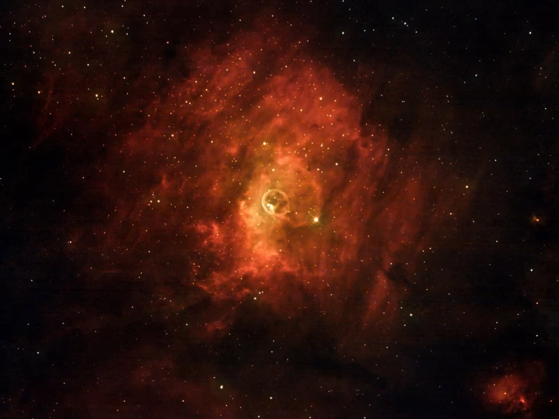 Туманность NGC 7635 — результат мощного «звездного ветра» от умирающего гиганта. А яркий пузырь — ударная волна, где этот ветер сталкивается с межзвездным газом и заставляет его светиться.