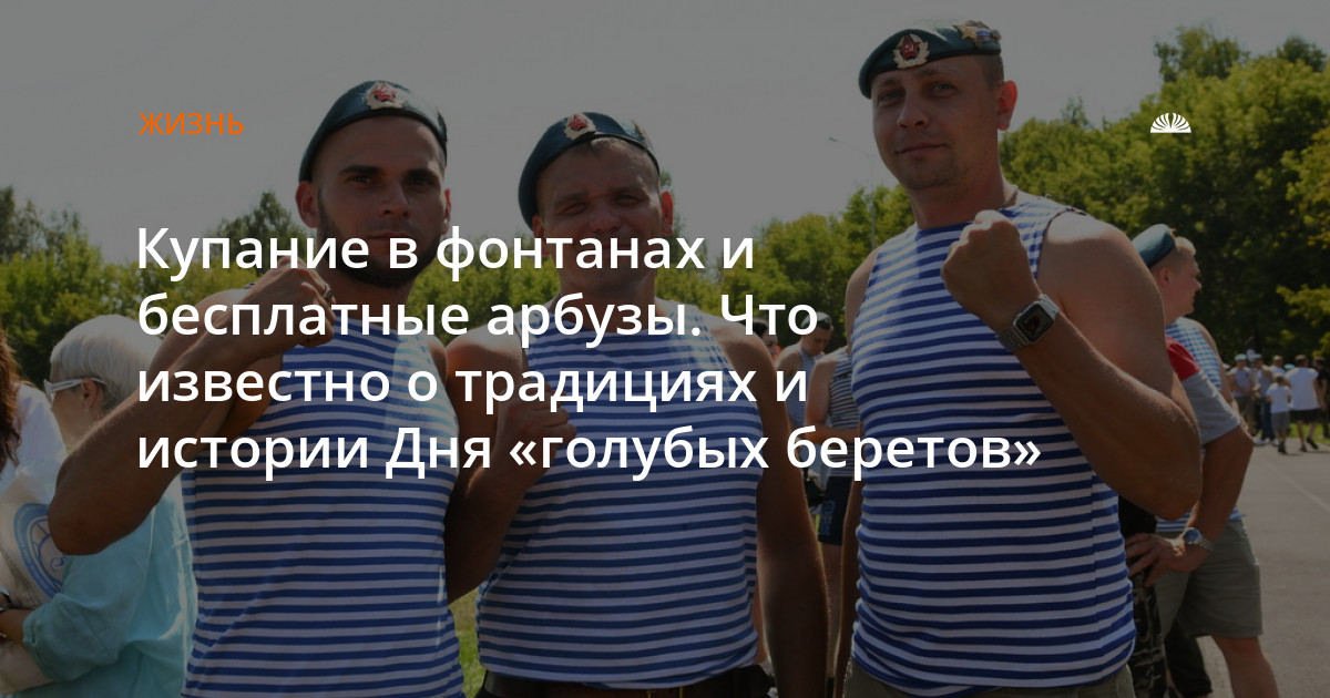 Другие утверждают, что традиция родилась в честь небесного покровителя ВДВ — пророка Илии, чей праздник тоже отмечается 2 августа. Раньше на Руси омывали лицо родниковой водой — это очищало душу. Поскольку родник отыскать непросто, десантники ныряют прямо в городские фонтаны.