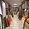На стенах – осыпавшаяся штукатурка, вдоль них — металлические стеллажи с картинами и сотнями накрытых тканью скульптур, в углах — рулоны с упаковочной бумагой.