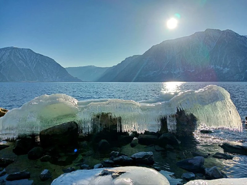 С наступлением морозов на берегу Телецкого озера появляются первые блестящие хрустальным сиянием «статуи». Причем бывает два вида таких природных творений: «Наплески» — ледяные панцири на скалах и валунах, и «Брызговое оледенение» — тысячи сосулек и натеков на крутых склонах.