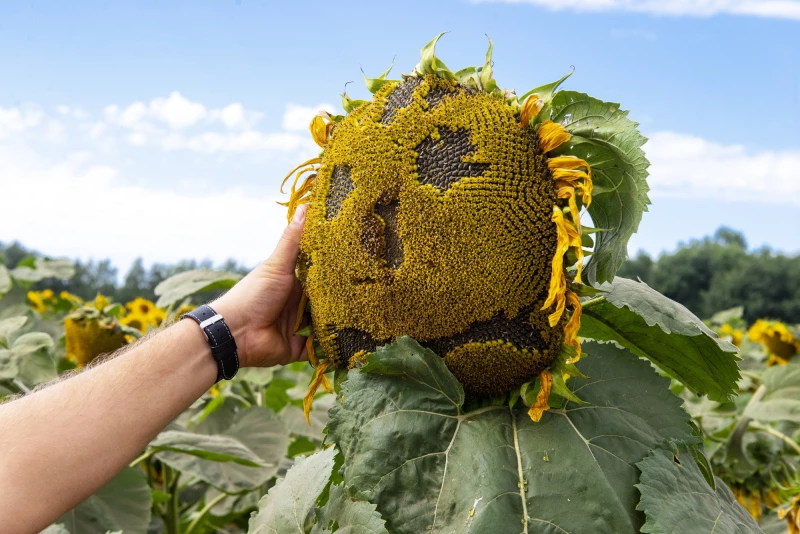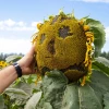 Кроме того, один из подсолнечников немного «взгрустнул» — некоторые семечки выпали, и корзинка стала похожа на печальную мордочку.