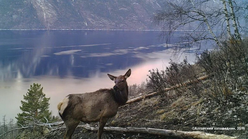 Звери справляются с преградой в виде палки на звериной тропе. Сегодня в объектив камеры попал крупный и сильный марал в лесном кластере «Аргут».