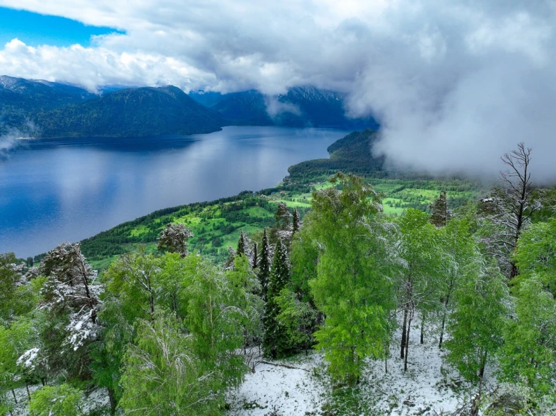 Ночью в конце мая возле Телецкого озера температура падала ниже нуля, позволяя зимнему холоду задержаться на горных вершинах.