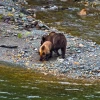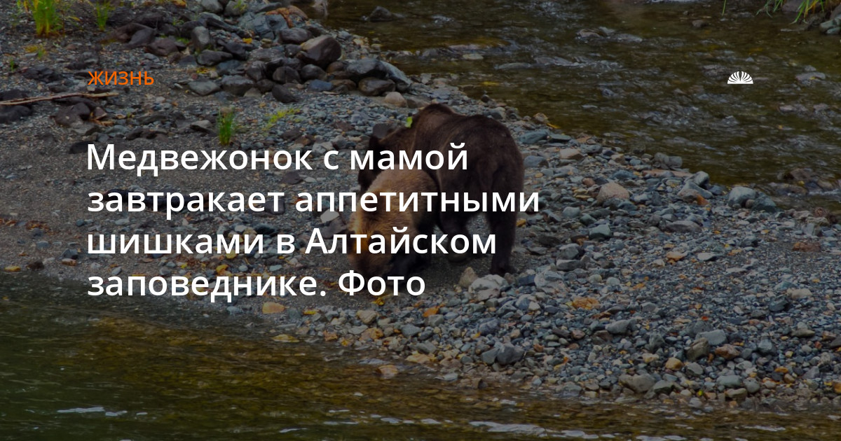Кроме того, на берег попадают и кедровые шишки, от которых медведи не могут отказаться. Медвежонок, который следует за мамой по пятам, успевает искупаться и поиграть в воде.