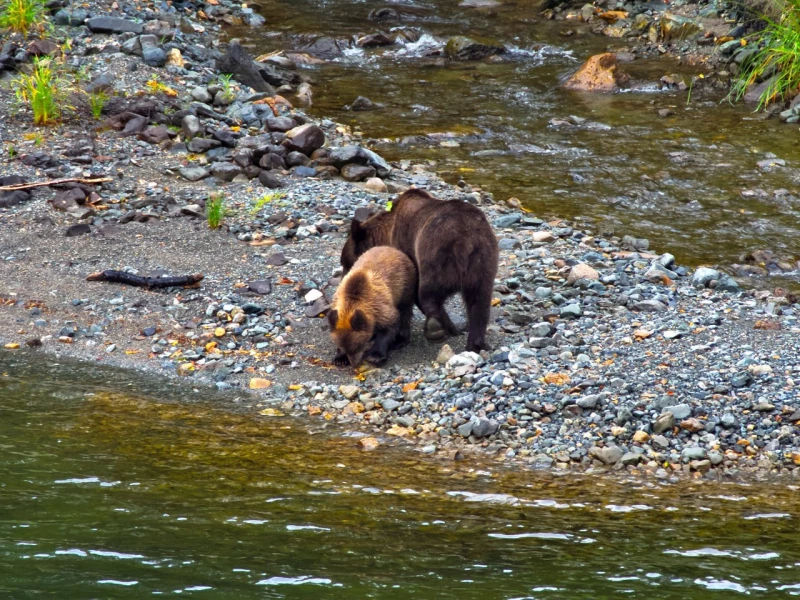 Медведицы редко выходят на открытые пространства с детенышами, только если для похода к берегу. После штормовой погоды на берег приносит много насекомых и личинок, которых косолапые будут с удовольствием есть.