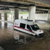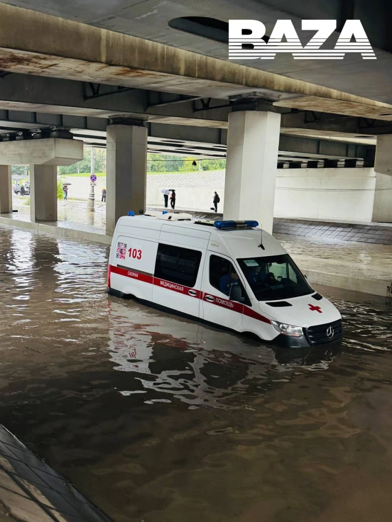 Из-за потопа на Шмитовском проезде встала машина скорой помощи, вместе с ней — десятки других автомобилей. Некоторые улицы стали непроходимыми, а местные жители достали резиновые сапоги.
