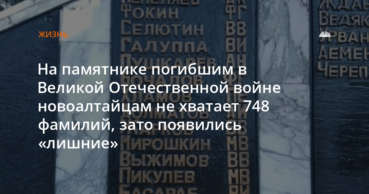 На памятнике должны быть 1532 фамилии новоалтайцев, погибших, умерших от ран и пропавших без вести во время Великой Отечественной. Однако на пилонах памятника записано всего 784 фамилии.