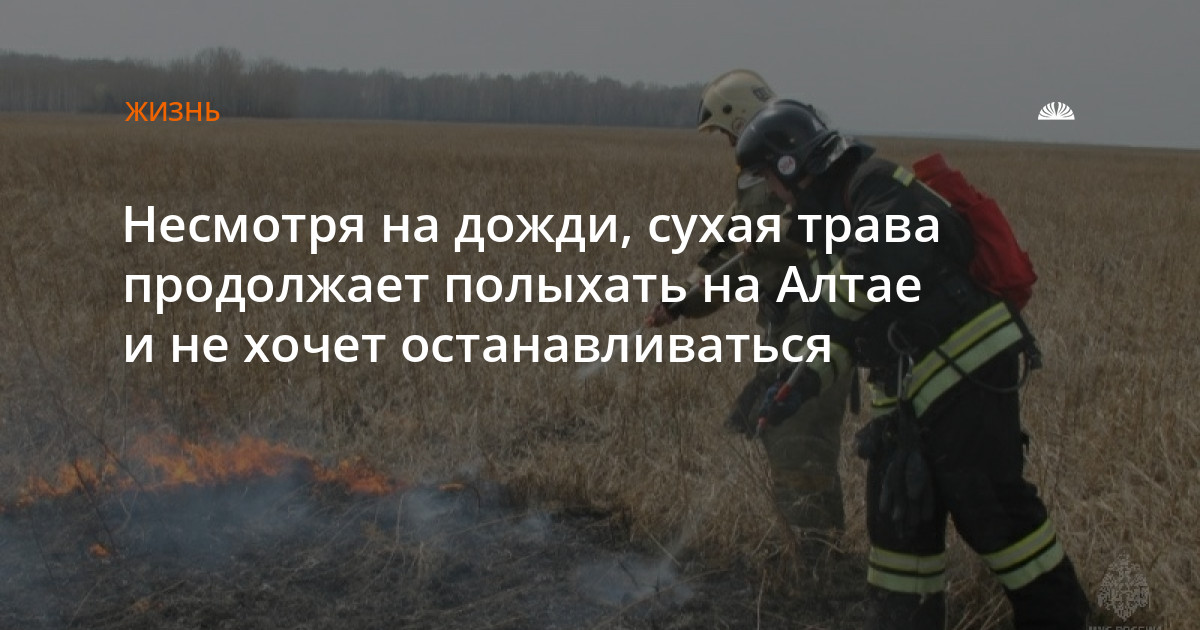 Несмотря на сильнейшие ливни, количество возгораний сухой травы и мусора в Алтайском крае растет. В районе поселка Новый пожарные ликвидировали горение травы площадью около 350 кв. м. В Бурлинском районе также горела трава, а огонь распространился на 250 «квадратов».
