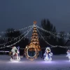 Волшебной ночи терпеливо ожидает и главная красавица Нового года — зеленая ель. А рядом с ней по заснеженным дорожкам «танцуют» сверкающие олени, карета с игрушками, веселые снеговики и герои любой детской мечты — Дед мороз со Снегурочкой.
