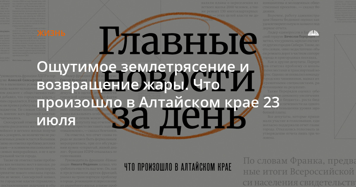 - Жители Барнаула почувствовали колебания от землетрясения, которое произошло в Казахстане сегодня, 23 июля, в 17:37. Эпицентр находился в 84 км от Усть-Каменогорска. Магнитуда составила 5,9.