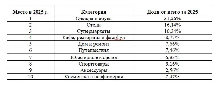 В поездках за границей россияне больше всего тратили на одежду и обувь (31,26% от общего объема трат за границей), отели (16,14%) и супермаркеты (10,34%). Первые две сохранили свои позиции второй год подряд, тогда как категория «Супермаркеты» поднялась на одну строчку вверх, заменив «Ювелирные изделия».