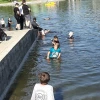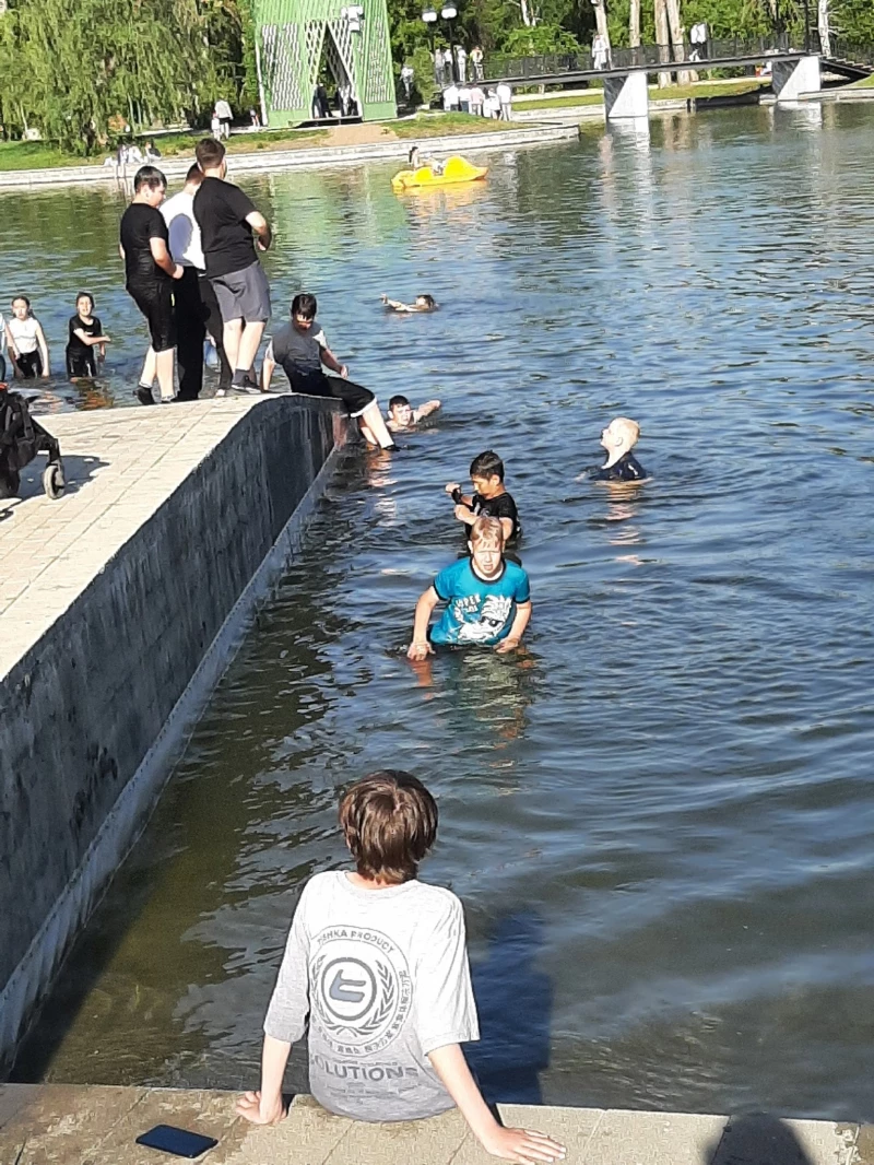 Несмотря на то, что купаться в пруду парка запрещено, подростков в такую жару это не останавливает. Дети не только аккуратно заходили в воду, но и прыгали бомбочками.