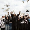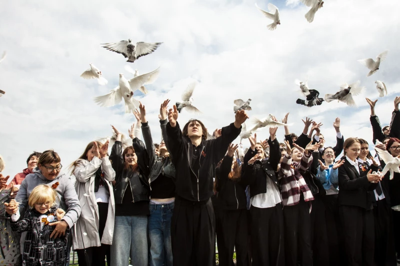 В небо взмыли более 30 голубей. На смотровой площадке собралось около 70 человек, включая школьников, педагогов, родителей и ветеранов.