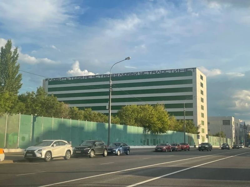 На кадре видно, что на фасаде дома написано: «Я любить тебя не устану, у любви усталости нет». Надпись появилась на здании в районе Ходынского поля.