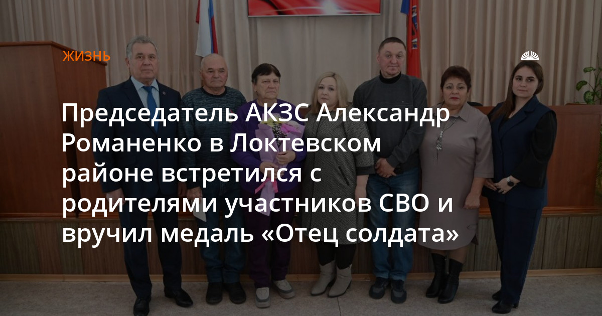 Добавим, что 17 октября, Александр Романенко вручит аналогичную награду в Рубцовске. Вместо недавно ушедшего из жизни Владимира Харитонова, ее получит мать солдата Татьяна Харитонова. Вместе с мужем они воспитали двоих сыновей, оба служили в армии. Старший — Вячеслав служил по контракту, находился в длительных командировках в Чеченской Республике. За мужество и отвагу был удостоен государственных наград. В 2022 году встал в ряды защитников Донбасса и Новоросии. За храбрость и самоотверженное выполнение боевой задачи был награжден медалью «Орден Мужества» — посмертно.