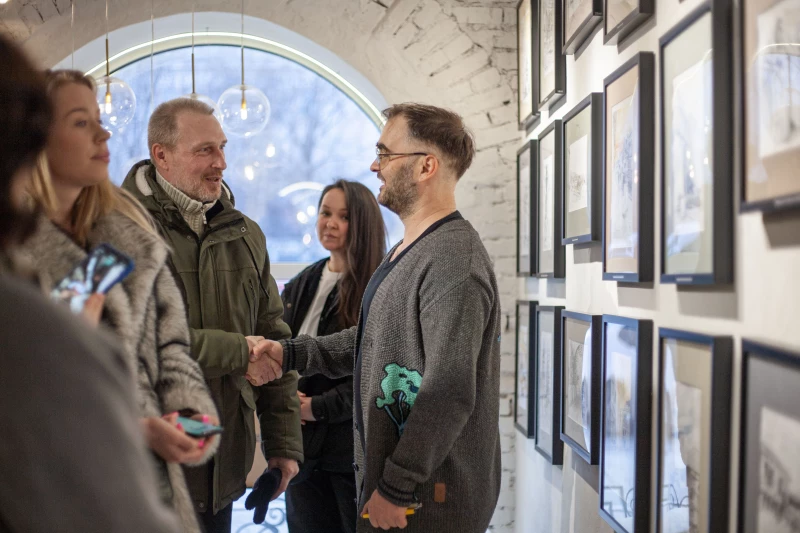 Стены новой галереи от и до увешаны рисунками Ивана, возле ресепшена — стеллаж с картинами на продажу, а ниже продаются скетчбуки художника с пестрыми наклейками из разных стран и ручками, прикрепленными к корочке. Рядом — открытки-репродукции с краткими описаниями мест зарисовки. На открытии художник бережно подписывал каждую из них.