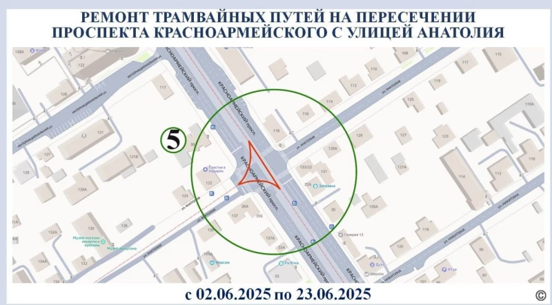 С 22:00 часов 2 июня будет перекрыто движение транспорта на пр. Красноармейском в направлении от ул. Анатолия до пл. Спартака. Ограничение связано с капитальным ремонтом трамвайного переезда на пересечении с ул. Анатолия. Завершение работ запланировано на 23 июня.