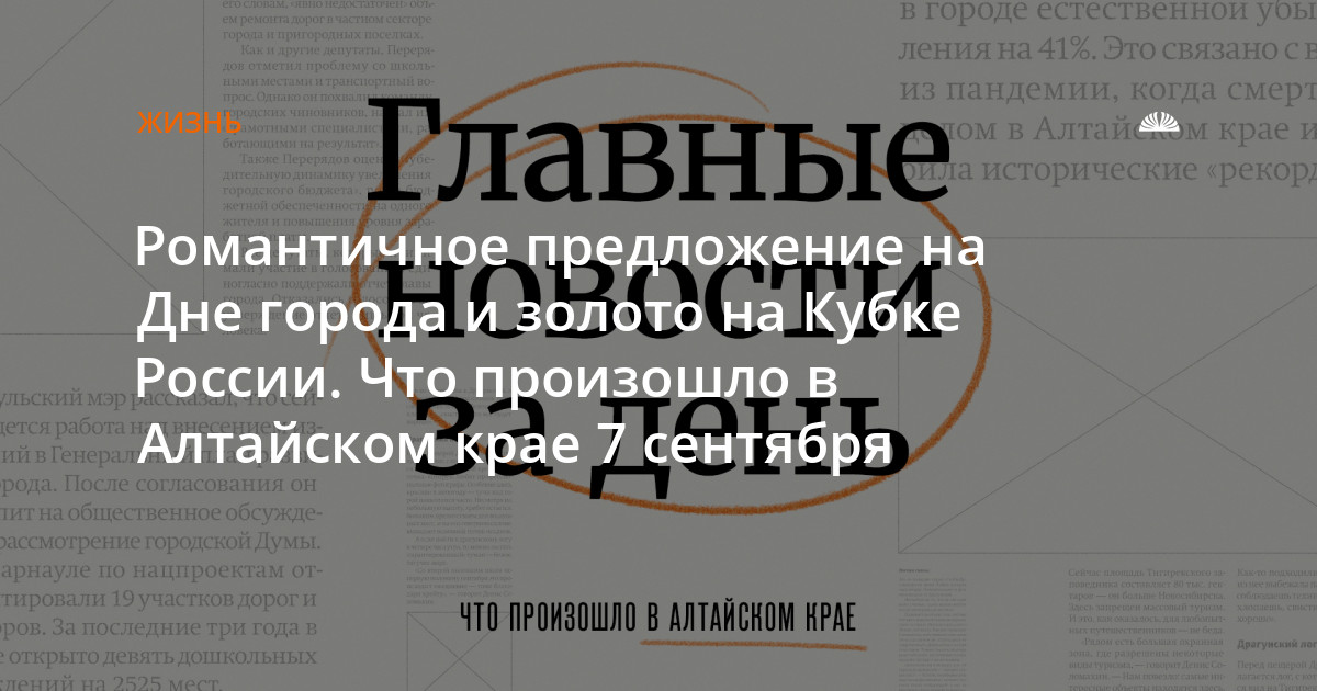 - Житель Горно-Алтайска на Дне города сделал самое романтичное предложение своей девушке. Александр встал перед ней на одно колено перед сотнями зрителей, после чего она ответила: «Да!»;