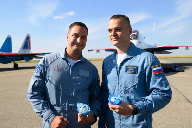 И не только небо, но и земля — пилотов привечали, что называется, хлебом-солью: девушки в русских национальных нарядах угостили летчиков вкусным тортом и именными сладостями.