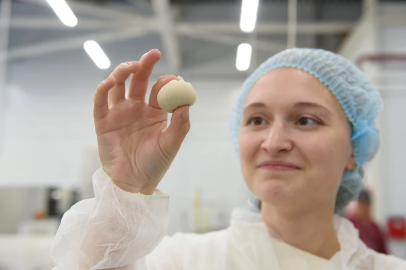 Параллельно в другом цехе замешивают тесто. В его состав входят вода, пшеничная мука высшего сорта, яйца, растительное масло, соль и, конечно, любовь — все натуральное, рассказывает тестосоставитель Юлия. Она работает на предприятии уже 17 лет. Директор по производству отмечает, что хороший тестосоставитель сейчас на вес золота.