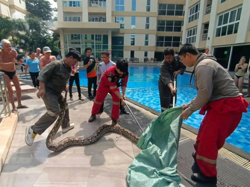 Домработница обнаружила хвост змеи, свисающий с потолка в ванной комнате рядом с бассейном. Первые попытки поймать скользкого гиганта оказались безуспешными, и питон ушел глубже в стену здания.