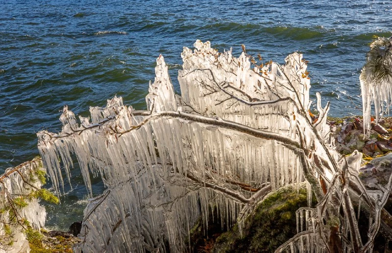 Такой чудотворный процесс происходит каждый год. Сильный ветер «верховка» разбивает воду о скалы, а мороз мгновенно заковывает брызги в лед.