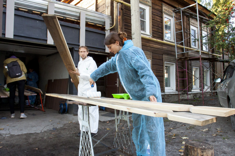 «Шорк-шорк-шорк» — наждачка с усилием проходит по бревенчатой стене, покрытой вековой пылью, и оставляет светлый след. Пока мы с координатором фестиваля, архитектором Олесей Петуховой сидим на лесах и вручную шлифуем фасад на ул. Анатолия, 162, у дома останавливается женщина.