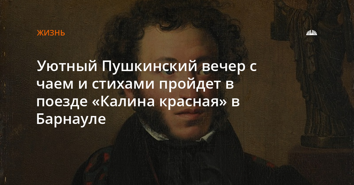 Компания «Алтай-Пригород» подготовила событие в чайном вагоне 6 июня. Встречу в честь дня рождения А. С. Пушкина проведет писатель и член Союза писателей России Иван Образцов.