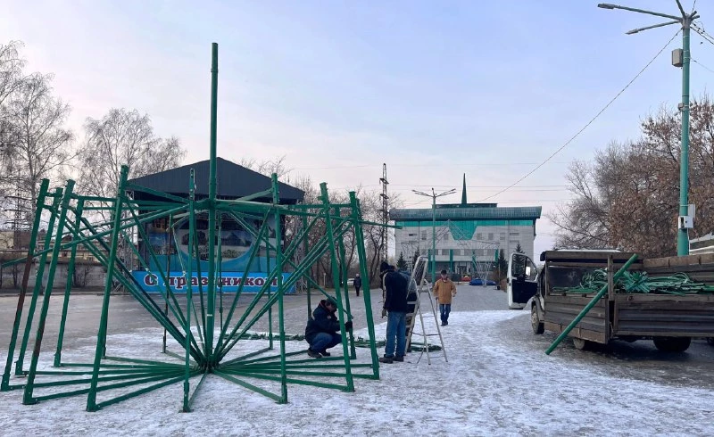 Невзирая на погодные условия, атмосфера уже наполняется предчувствием торжества. В центре Бийска уже начали собирать праздничную елочку — начало каркаса уже стоит у сцены.